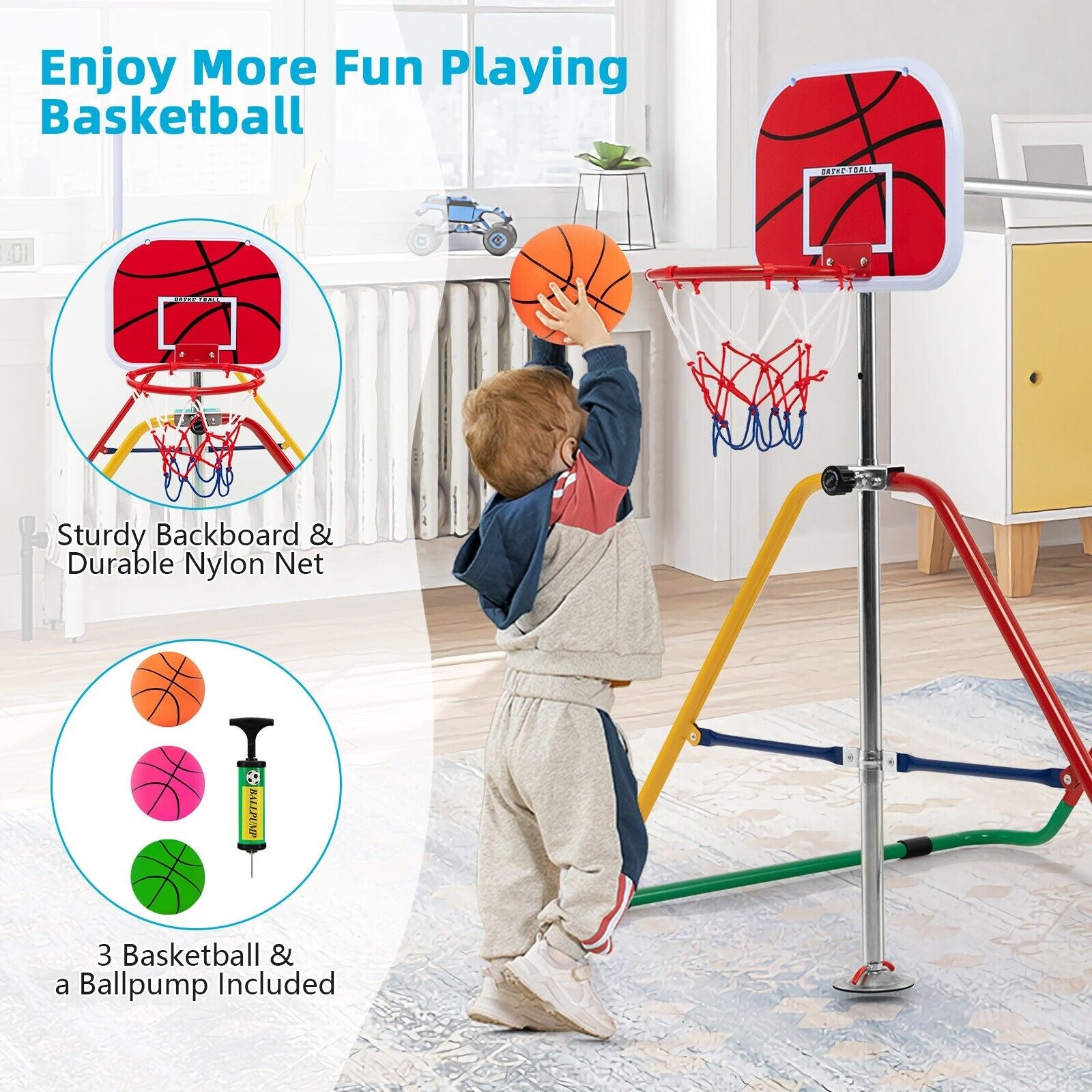 This indoor gymnastics equipment combines a horizontal bar and a basketball hoop offering endless fun to kids and promoting growth during happy exercise.