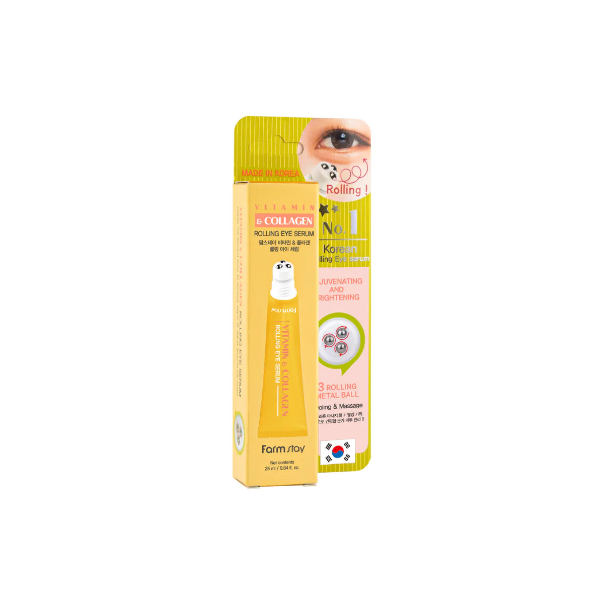 The Farm Stay Vitamin & Collagen Rolling Eye Serum 25ml is a Korean eye serum designed to target the delicate skin around the eyes with a lightweight, fast-absorbing gel formula and a convenient roll-on applicator. Infused with hydrolyzed collagen, essential vitamins (such as Vitamin C, Vitamin E, and Panthenol), and niacinamide, it helps deliver intense hydration, smooth fine lines, boost skin elasticity, and brighten the under-eye area. The built-in metal rollerball gently massages the eye area to improve circulation and reduce puffiness, enhancing absorption without irritation. Its non-greasy texture makes it suitable for both daytime and nighttime use and works well under makeup.